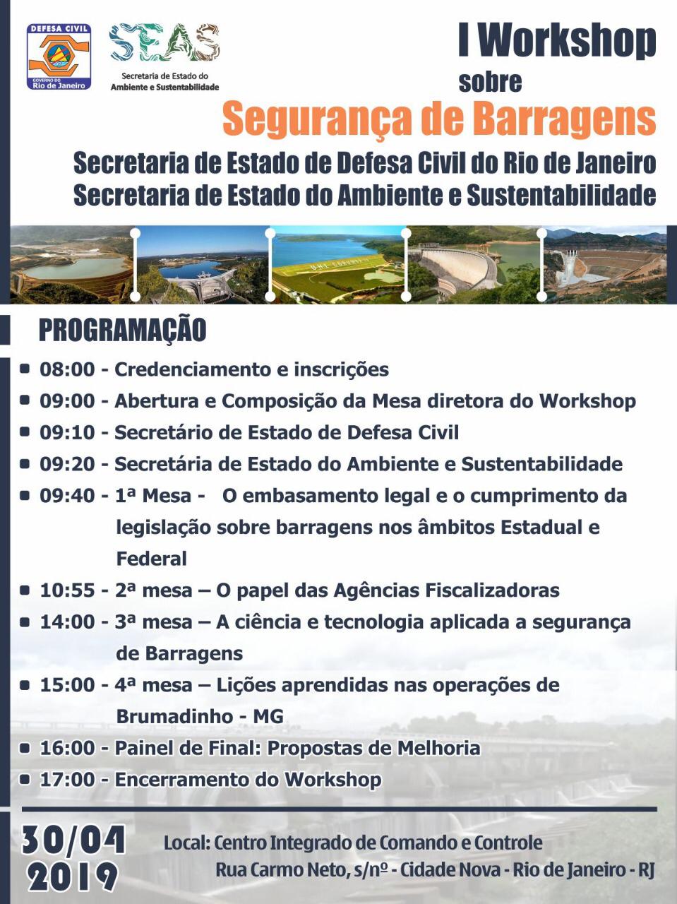 A Secretaria de Estado de Defesa Civil (Sedec-RJ) está com inscrições abertas para o I Workshop sobre segurança de barragens. O evento será realizado no dia 30 de abril, em parceria com a Secretaria de Estado do Ambiente e Sustentabilidade. Estão disponíveis 100 vagas. As inscrições podem ser feitas por meio do endereço: https://eventfy.net/iworkshopdebarragen/