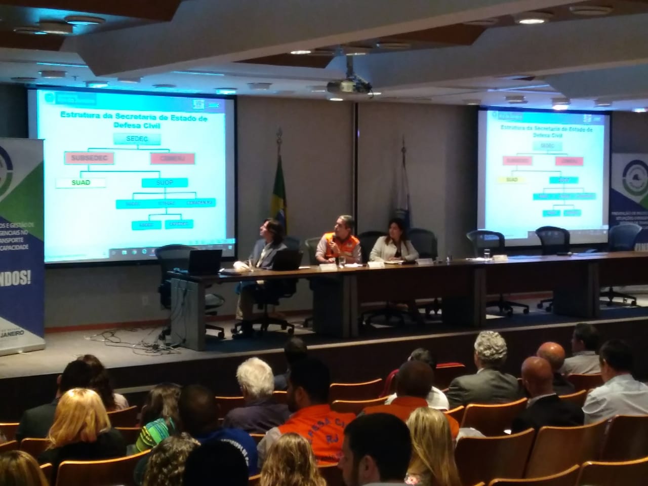 A Defesa Civil Estadual marcou presença, no dia 22 de maio, no seminário “Diálogo Produtivo: prevenção de riscos e gestão de situações emergenciais no sistema de transporte público de alta capacidade”. A iniciativa foi promovida pela Agetransp (Agência Reguladora de Serviços Públicos Concedidos de Transportes Aquaviários, Ferroviários e Metroviários e de Rodovias do Estado do Rio de Janeiro). Cerca de 200 pessoas participaram do evento, realizado no auditório da Procuradoria Geral do Estado (PGE), no Centro do Rio.