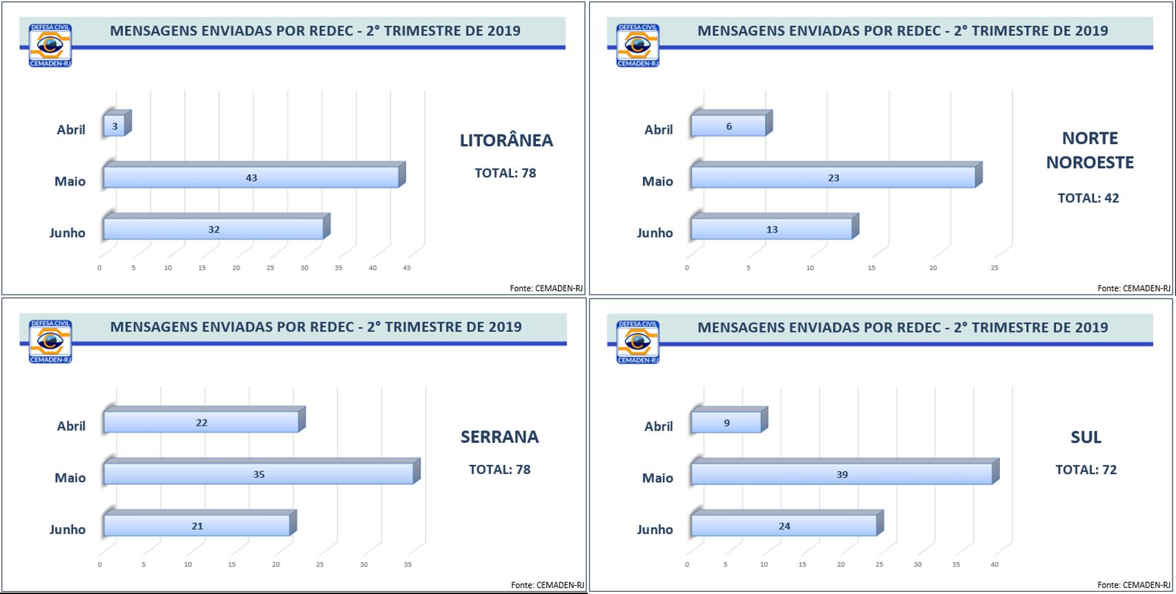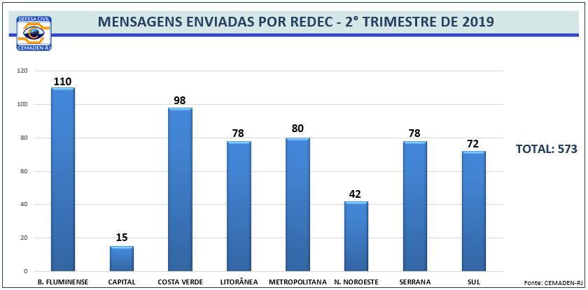 No segundo trimestre, foram emitidas 573 mensagens. As datas que tiveram maior número de envios de SMS foram 16 e 17 de maio e 03 de junho. Os municípios que registraram os maiores aumentos de cadastros foram: Arraial do Cabo, Rio de Janeiro, Niterói, Cabo Frio, Maricá, São Pedro da Aldeia, Saquarema, Rio das Ostras e Macaé. No ranking de maior percentual de CEPs inscritos estão Angra dos Reis, Nova Friburgo, Mangaratiba, Niterói, Petrópolis, Teresópolis, Areal, Paraty, Maricá e Armação dos Búzios.