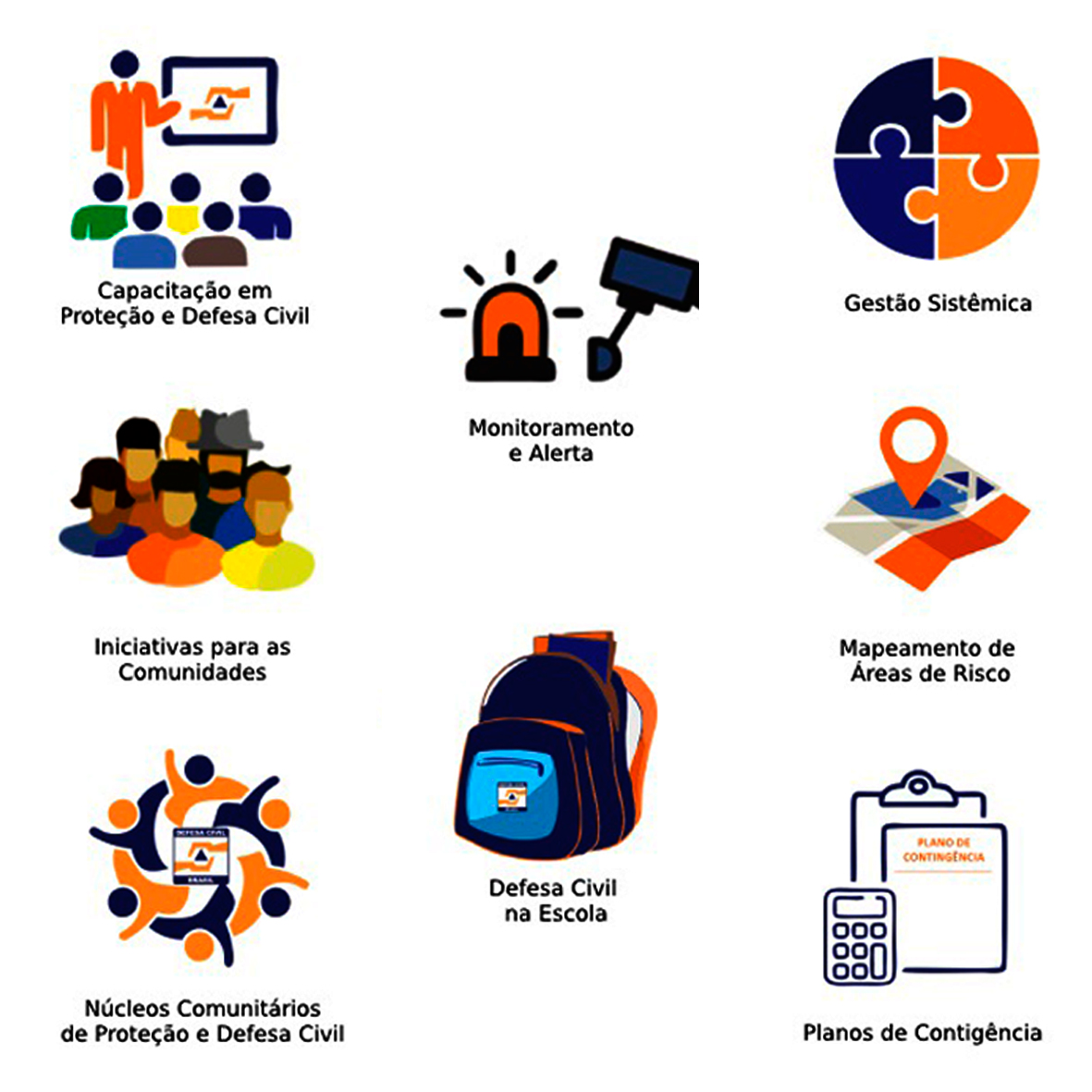 O documento reúne 78 iniciativas de sucesso, que foram organizadas com base nos seguintes temas: Capacitação, Gestão Sistêmica, Mapeamento de Áreas de Risco, Núcleos Comunitários, Defesa Civil na Escola, Monitoramento e Alerta, Iniciativas para as Comunidades e Planos de Contingência.
