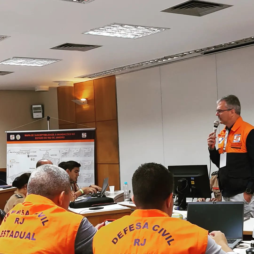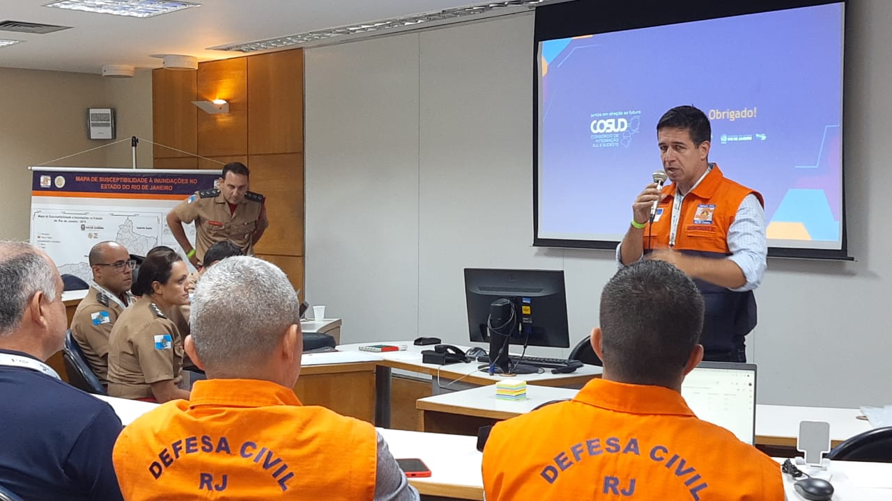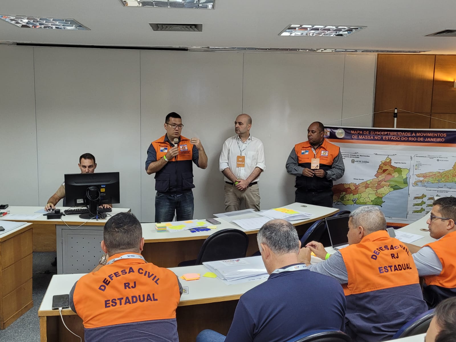 Durante o encontro, o Centro Estadual de Monitoramento e Alerta de Desastres Naturais do Rio de Janeiro (Cemaden-RJ) apresentou os protocolos e produtos desenvolvidos pelas equipes de Meteorologia, Hidrologia e Geologia da Sedec-RJ.