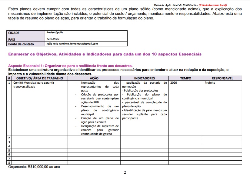 As prioridades de ação (2015-2030) do Marco de Sendai para a Redução de Risco de Desastres definem ações e benefícios que o desenvolvimento das atividades da campanha poderão trazer para a municipalidade, tais como: