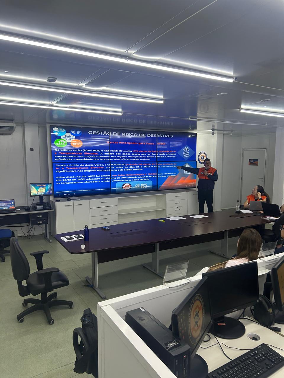 Na sequência, o CEMADEN-RJ realizou uma palestra técnica com o objetivo de alinhar conceitos, apresentar os parâmetros meteorológicos e qualificar o entendimento institucional sobre a tipologia de desastre natural associada às ondas de calor.
