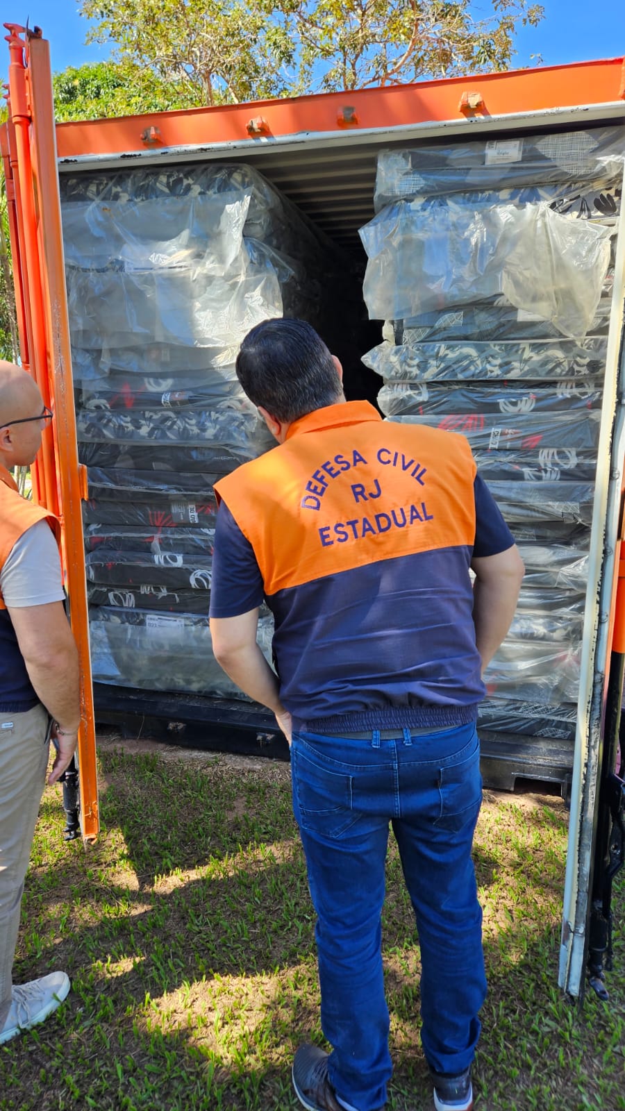 Durante a inspeção, foram conferidos colchões e kits dormitório, sendo constatado que tanto o material quanto o contêiner se encontram em perfeitas condições de uso. Após a verificação, o contêiner foi devidamente fechado e lacrado, assegurando a integridade dos itens.