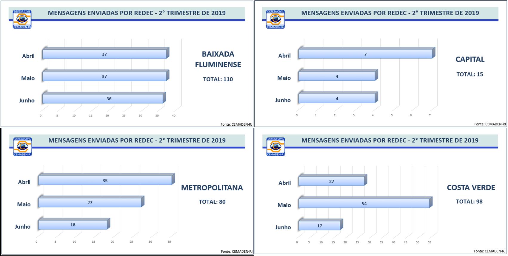 No segundo trimestre, foram emitidas 573 mensagens. As datas que tiveram maior número de envios de SMS foram 16 e 17 de maio e 03 de junho. Os municípios que registraram os maiores aumentos de cadastros foram: Arraial do Cabo, Rio de Janeiro, Niterói, Cabo Frio, Maricá, São Pedro da Aldeia, Saquarema, Rio das Ostras e Macaé. No ranking de maior percentual de CEPs inscritos estão Angra dos Reis, Nova Friburgo, Mangaratiba, Niterói, Petrópolis, Teresópolis, Areal, Paraty, Maricá e Armação dos Búzios.