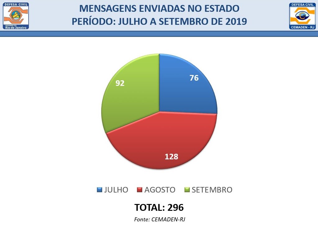 A Secretaria de Estado de Defesa Civil (Sedec-RJ), por meio do Centro Estadual de Monitoramento e Alerta de Desastres Naturais (Cemaden-RJ), divulgou o balanço dos dados estatísticos do terceiro trimestre de 2019 de mensagens enviadas por SMS.