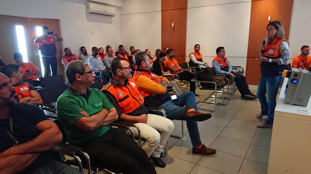 Capacitação focou em protocolos de acionamento de sirenes e registro de ocorrências locais. Houve, ainda, esclarecimentos sobre riscos hidrológicos e geológicos