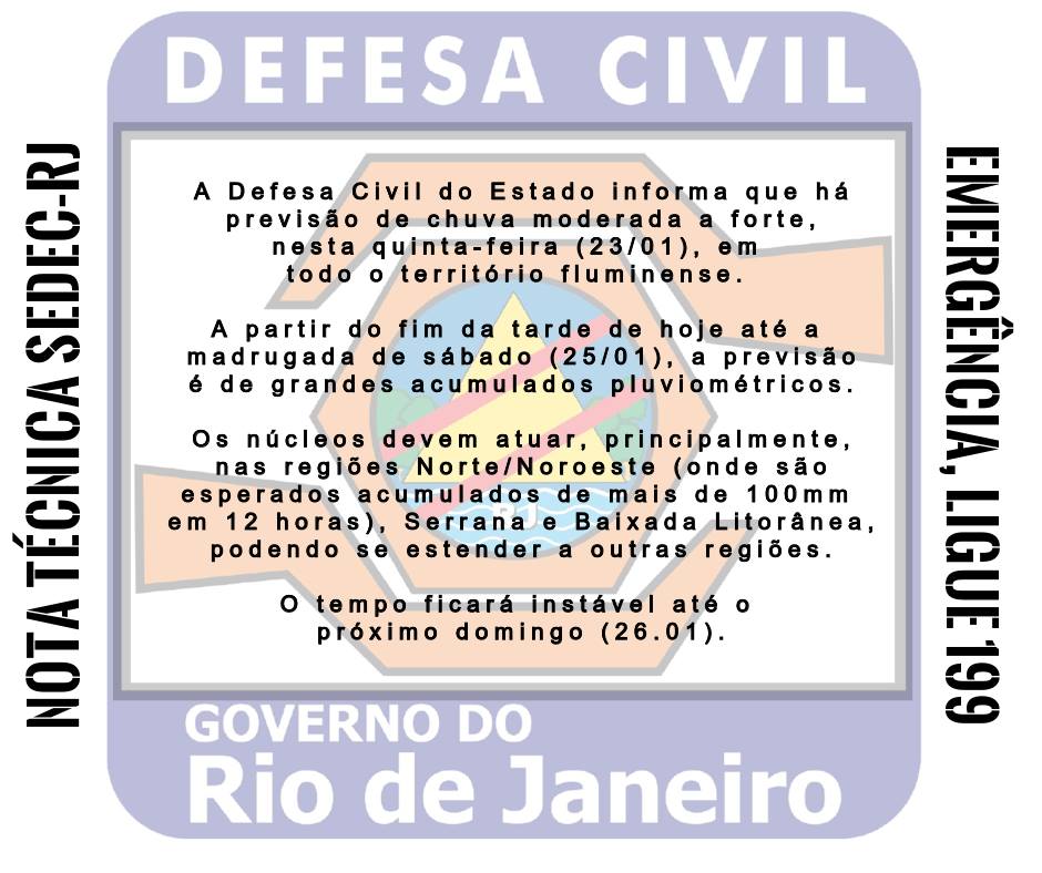 A Secretaria de Estado de Defesa Civil (Sedec-RJ) informa que acompanha as condições meteorológicas de todo o território fluminense. De acordo com o Centro Estadual de Monitoramento e Alerta de Desastres (Cemaden), há previsão de chuva forte a partir da tarde desta quinta-feira (23.01) no Estado.