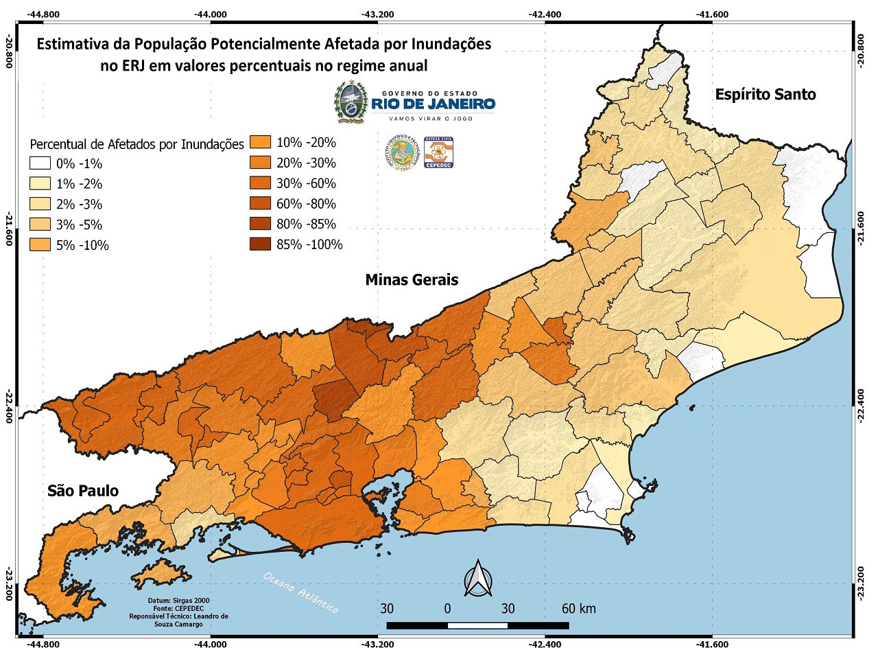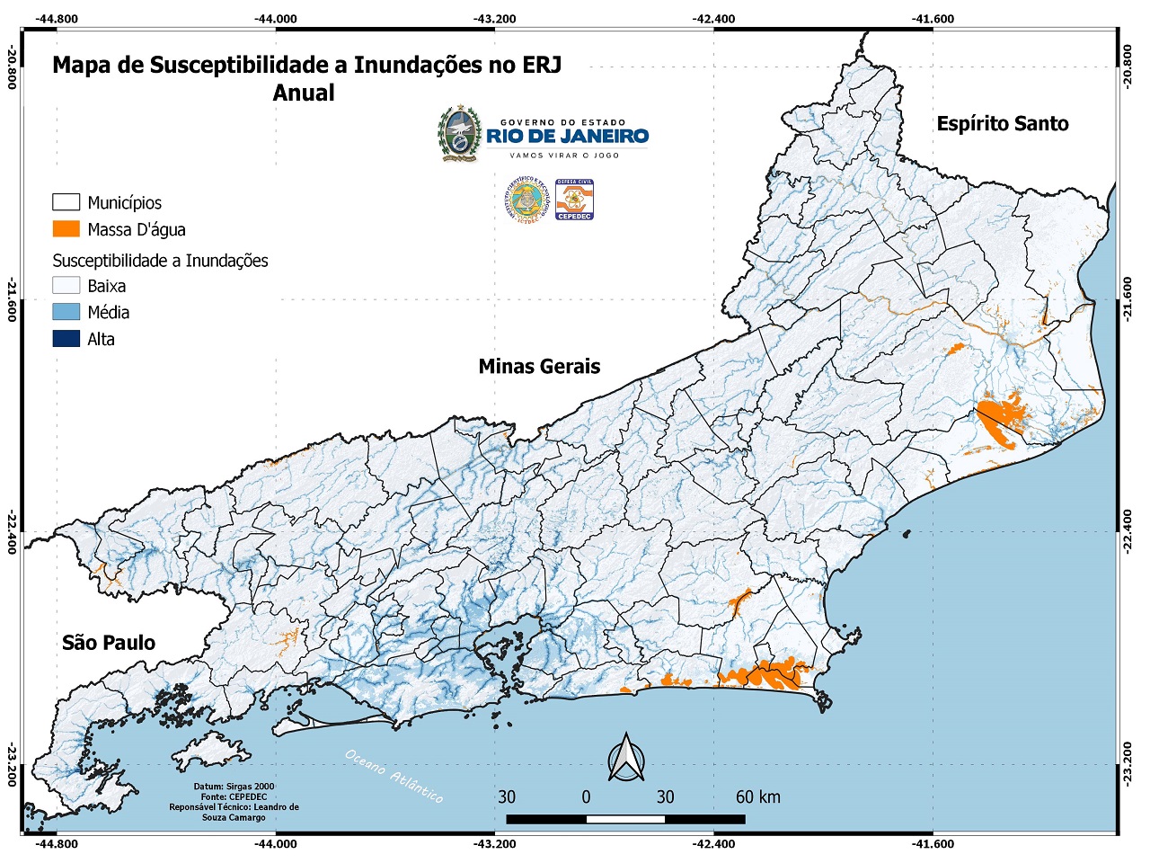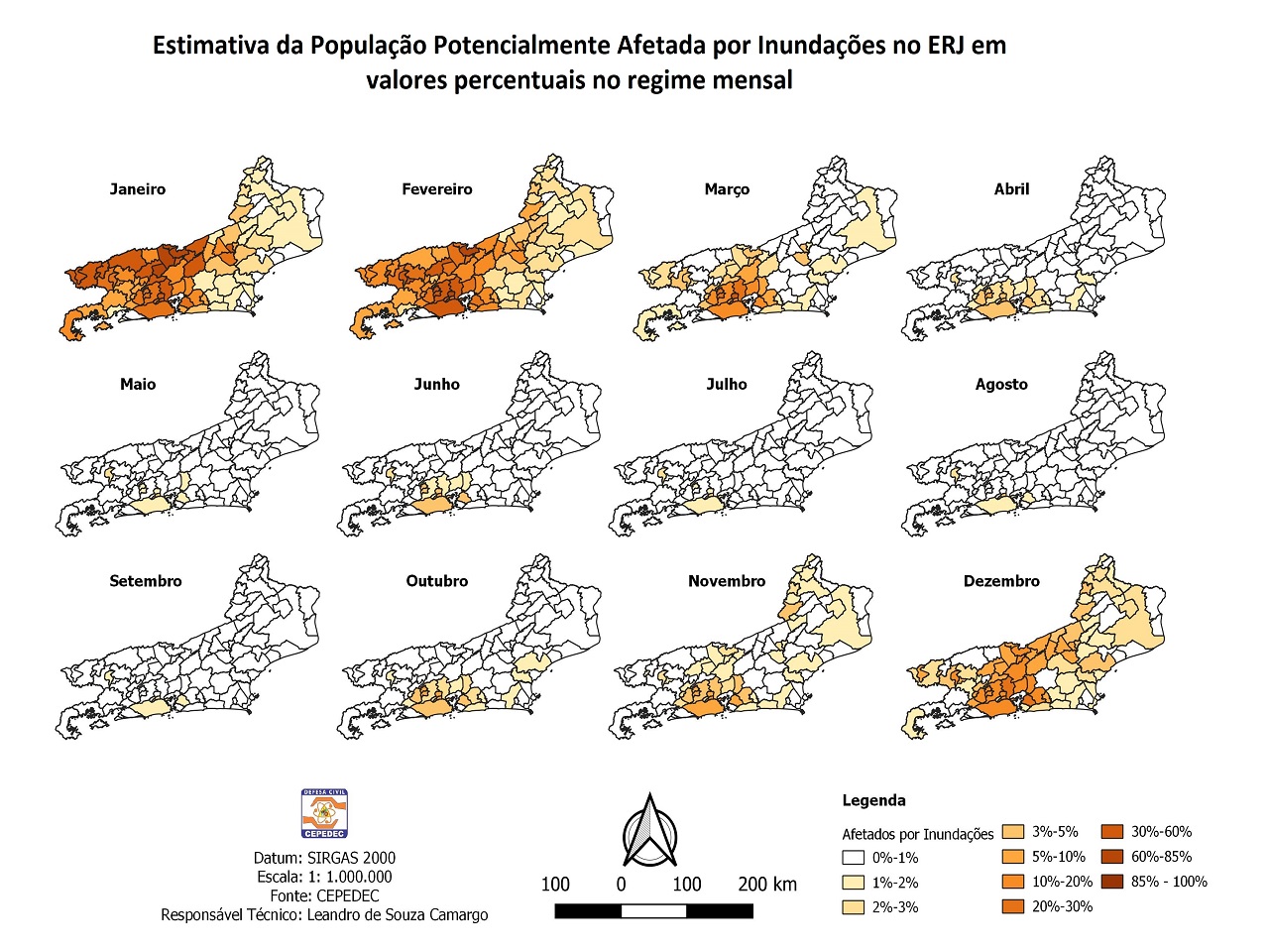 A Defesa Civil Estadual (Sedec-RJ) mapeou as áreas com maior suscetibilidade a inundações no Estado do Rio de Janeiro, com base em dados dos últimos 23 anos. O estudo permite identificar possíveis ameaças e cenários críticos para cada mês do ano, de acordo com a sazonalidade, de modo a fundamentar a tomada de decisões técnicas. O trabalho, realizado pelo Centro de Estudos e Pesquisas em Defesa Civil (Cepedec) com apoio do Centro Estadual de Monitoramento e Alerta de Desastres Naturais (Cemaden-RJ), também faz uma estimativa da população afetada por este tipo de evento em cada época do ano, contribuindo para a gestão de desastres e favorecendo as ações de prevenção.