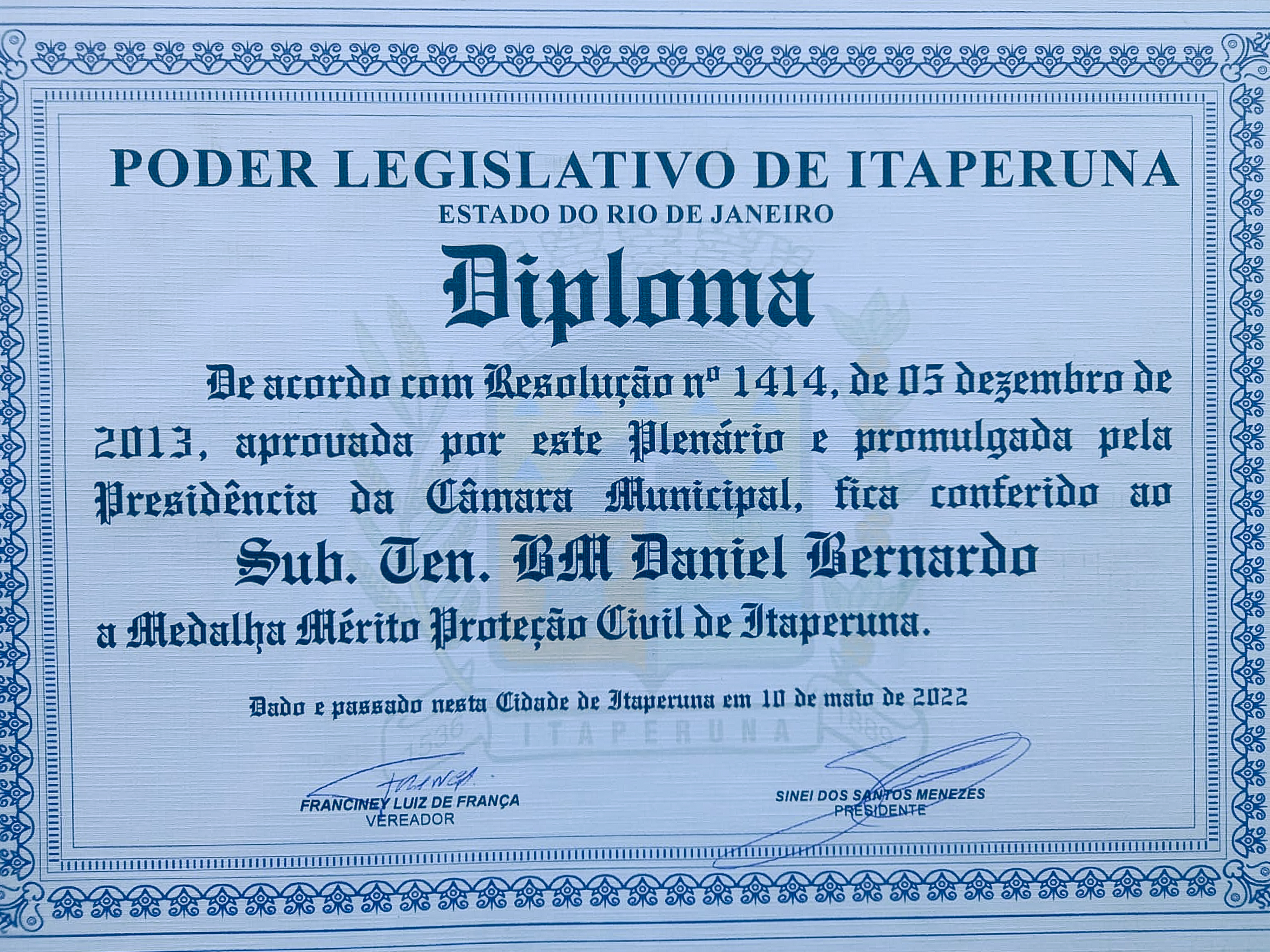 Nesta terça-feira (10.05) o subtenente Daniel Bernardo, da Redec Noroeste, recebeu a Medalha de Proteção e Defesa Civil da Câmara Municipal de Itaperuna-RJ.